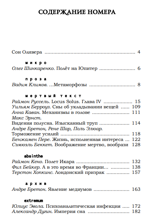 Урок давно закончился. И действительно… чья-то рука хватает Оливера за косичку и дергает что есть силы. Звенит звонок. Оливер открывает глаза, поднимается с кровати и едет на другой конец города. Оливер работает манекеном в витрине похоронного бюро. Под мышкой у него Опустошитель #48. Сновидение. Сэмюэль Беккет, Раймон Кено, Андре Бретон, Юлиус Эвола, Раймон Руссель, Александр Дугин, Поль Элюар, Вадим Климов и даже Уильям Берроуз с Анной Каван, не считая всех остальных, в апрельском номере любимого журнала. Спят и видят, как проходит их жизнь.